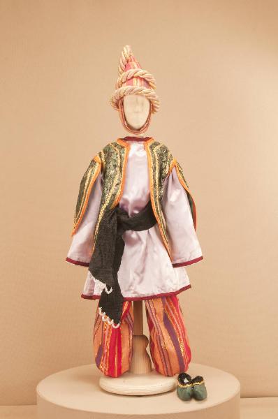 Costume fantastico orientale composto da pantaloni, bolero, veste, fusciacca, soggolo e scarpe. Il cappello che completa il costume ha il codice GOR 03376.