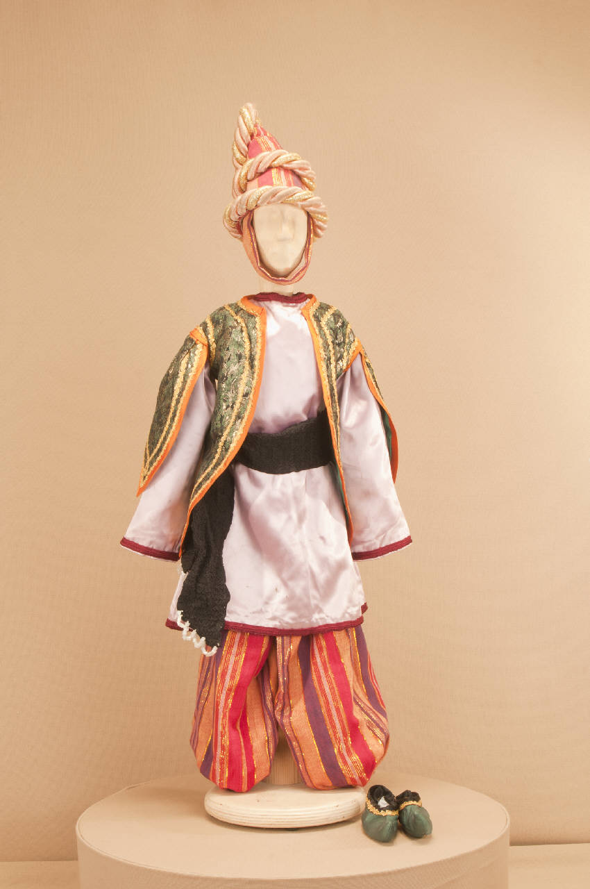 Costume fantastico orientale composto da pantaloni, bolero, veste, fusciacca, soggolo e scarpe. Il cappello che completa il costume ha il codice GOR 03378.