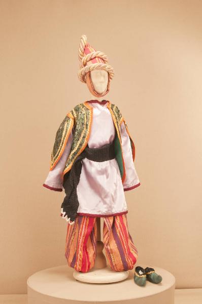 Costume fantastico orientale composto da pantaloni, bolero, veste, fusciacca, soggolo e scarpe. Il cappello che completa il costume ha il codice GOR 03379.
