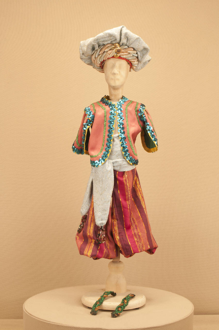 Costume fantastico orientale composto da pantaloni, bolero, bracciali e fusciacca. Il turbante che completa il costume ha il codice GOR 03429.