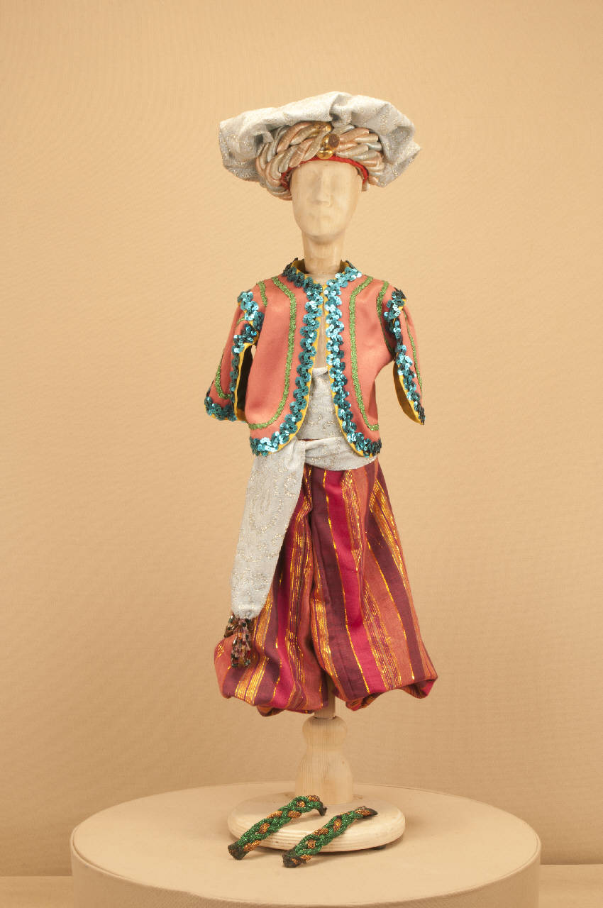 Costume fantastico orientale composto da pantaloni, bolero, bracciali e fusciacca. Il turbante che completa il costume ha il codice GOR 03429.