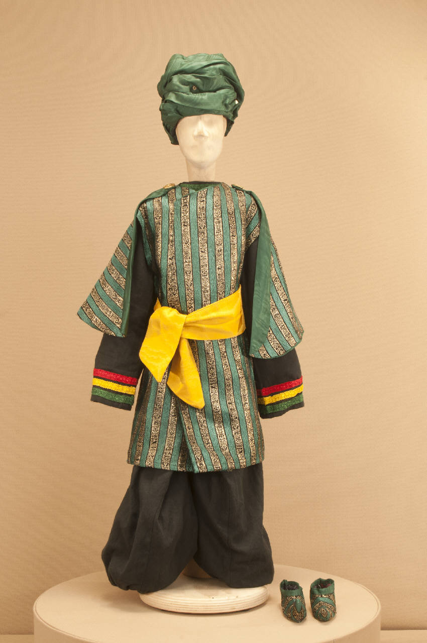 Costume folcloristico orientale composto da pantaloni, corpino, sopravveste, fusciacca, mantellina e scarpe. Il turbante che completa il costume ha il codice GOR 06808.