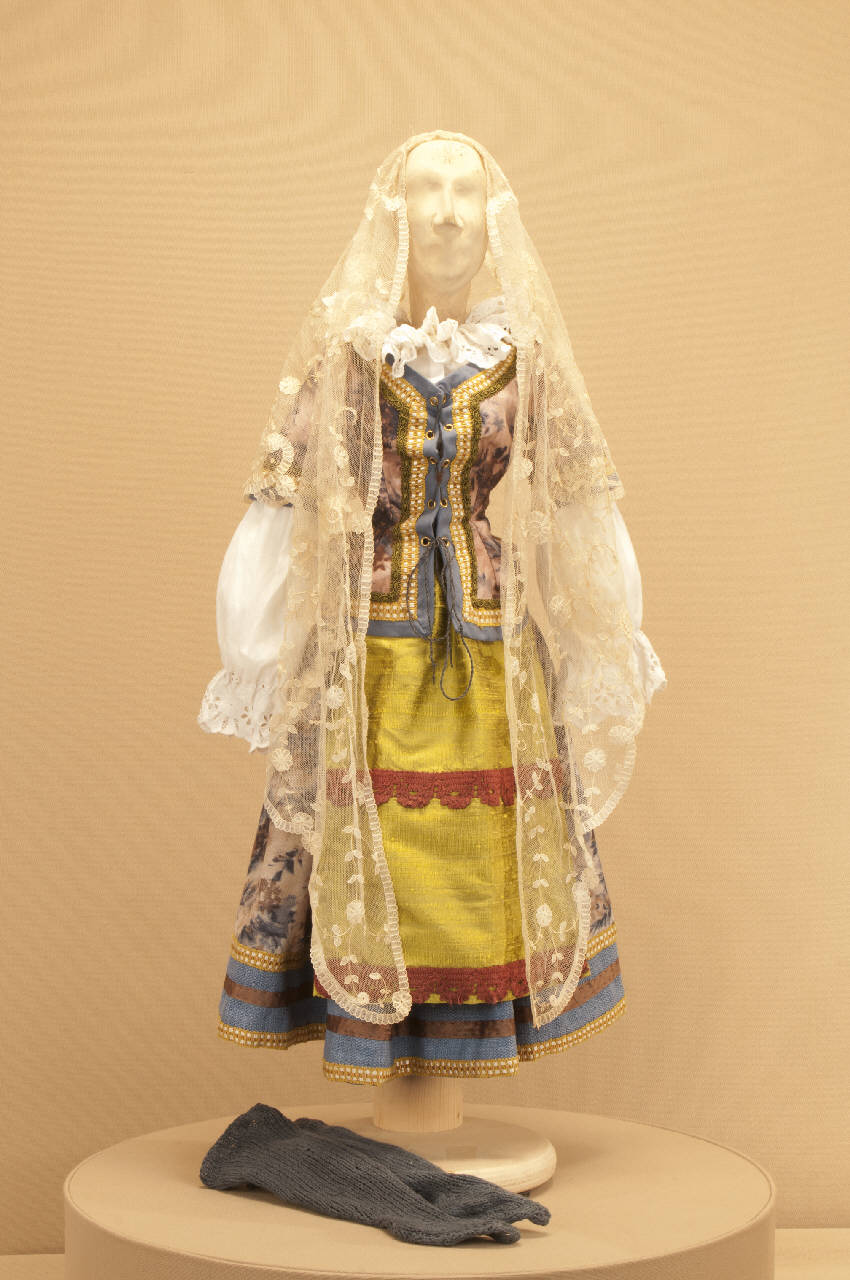 - NOTIZIE STORICO CRITICHE Il costume, che si completa con un paio di zoccoli di legno e con una raggera, è stato realizzato per il riallestimento del 2014, all'Atelier Carlo Colla e Figli, dello spettacolo "I promessi sposi". Lo spettacolo entra nel repertorio della Compagnia Colla dopo il 1861, data in cui la Compagnia originaria si divide in tre ceppi. Alla formazione che porta il nome di Compagnia Carlo Colla & Figli viene assegnato, nella spartizione del materiale, il suddetto manoscritto. Ne ritroviamo la titolazione sul Libro Mastro soltanto il 19 Aprile del 1879, nella piazza di Sannazzaro.\nA ricordo di Carlo II Colla lo spettacolo seguiva una traccia piuttosto romanzata e poco fedele alla scritturazione manzoniana. Si chiudeva dopo la processione, poiché di tutto il capitolo che riguardava la peste, essendo questa malattia ancora diffusa tra le popolazioni, non si riteneva opportuno parlare. Nel 1927 Carlo II Colla curò un nuovo allestimento, andato in scena il 30 Aprile nella sala del Teatro Gerolamo, rifacendo molte scenografie e molti costumi, rinnovando ed allargando il vecchio materiale di sartoria. Rimasero così due scene del pittore Luigi Mens ("Interno casa di Lucia", "Palazzotto in Milano di Don Rodrigo"). Per le restanti ambientazioni Carlo II Colla si rivolse al pittore Achille Lualdi che operava già con la Compagnia dal 1911, con il quale si recò sui luoghi manzoniani perché i bozzetti delle scenografie rispettassero la geografia descritta dall¿autore. Nel 1996 Eugenio Monti Colla curò una nuova edizione dello spettacolo rifacendo alcuni costumi, aggiungendo alcuni episodi al testo e sostituendo la musica di Enrico Petrella con quella di Amilcare Ponchielli. Venne anche sostituito il personaggio maschera di Gerolamo, che impersonava Don Abbondio, con un carattere più consono a quello voluto dall¿attore. Nelle edizioni del 2004 e del 2014 è continuata l¿opera di rifacimento di alcuni costumi.