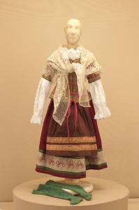 Costume da popolana di foggia seicentesca composto da gonna, camicia, bustino, grembiule, calze e scialle.