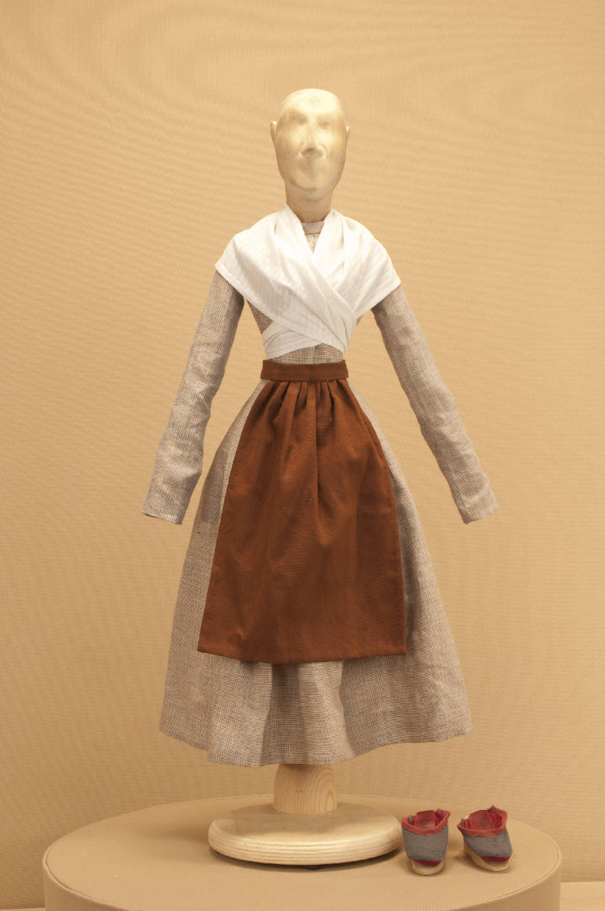 Costume da popolana di foggia seicentesca composto da veste, grembiule, scialle e pantofole.