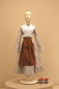 Costume da popolana di foggia seicentesca composto da veste, grembiule, scialle e pantofole.