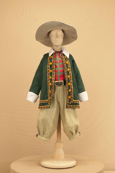 Costume da popolano di foggia seicentesca composto da calzoni, giacca, gilet, cintura. Si completa con cappello che ha codice GOR 15376.
