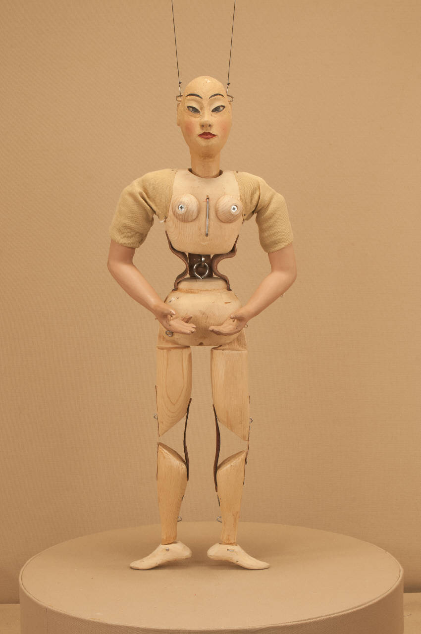 Testa in legno di tiglio fissata al corpo tramite ferro, occhi di vetro. Corpo in abete con busto tagliato in vita e raccordato con viti ad anello e cuoio. Gambe unite al bacino tramite bordione in ferro per movimento laterale, ginocchia con linguetta di metallo elastica, piede mobile. Braccia rigide e mani in tiglio con dita scolpite e parzialmente unite. Bilancino a croce per ballerini.