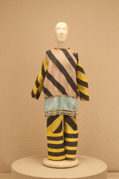 - NOTIZIE STORICO CRITICHE Il costume si completa con un paio di calzature in stile e con un elmo. Lo spettacolo "Il drago verde" è una grandiosa azione coreografica in nove quadri messa in scena da Carlo Colla per la Compagnia Marionettistica Carlo Colla e Figli. La musica è stata composta dai maestri Strigazzi e Gualtieri e le ricchissime scene sono state dipinte da A. Lualdi e L. Mens.\nLo spettacolo, in repertorio fin dalla metà dell¿Ottocento col titolo "I riti chinesi" e indicato sui libri mastri come "Ballo I Chinesi" e sui tamburini del quotidiano "La Sera" come Drago Verde (dal 1913 al 1918), fu rielaborato per un nuovo allestimento solo nel 1948 dopo un lungo oblio e presentato nuovamente sulle scene del Teatro Gerolamo di Milano. Lo spettacolo è stato ripreso nel 1985 al Teatro dell'Arte e portato a Berlino per il Festival Horizonte.\nContrariamente a quanto il titolo farebbe pensare non si tratta di un tema fiabesco, ma di un ballo a sfondo storico sulla lotta per il potere delle dinastie imperiali. Il drago a cui si allude nel titolo è un idolo che protegge la dinastia regnante e aiuta a sconfiggere ogni tentativo di rivolta della deposta dinastia.