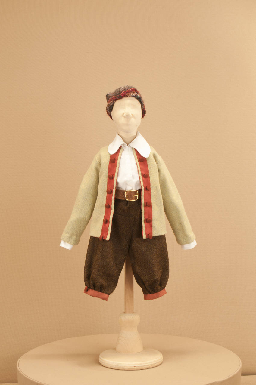 Costume da bambino popolano di foggia seicentesca composto da calzloni, camicia, giacca, cintura e cuffia.