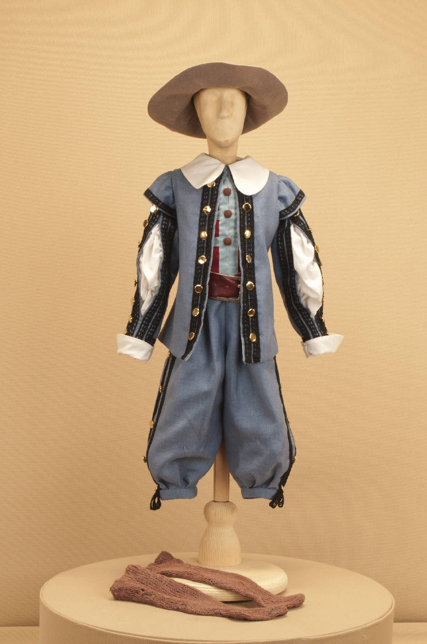 Costume da popolano di foggia seicentesca composto da calzoni, giacca, gilet, calze e cintura. Si completa con un cappello che ha il codice GOR 15378.