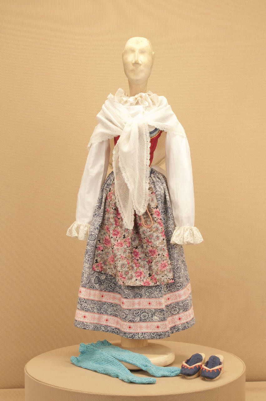 Costume da popolana di foggia seicentesca composto da gonna, camicia, bustino, grembiule, calze, pantofole e scialle.