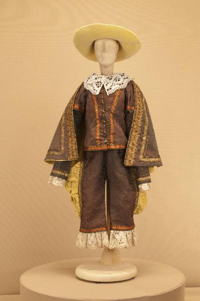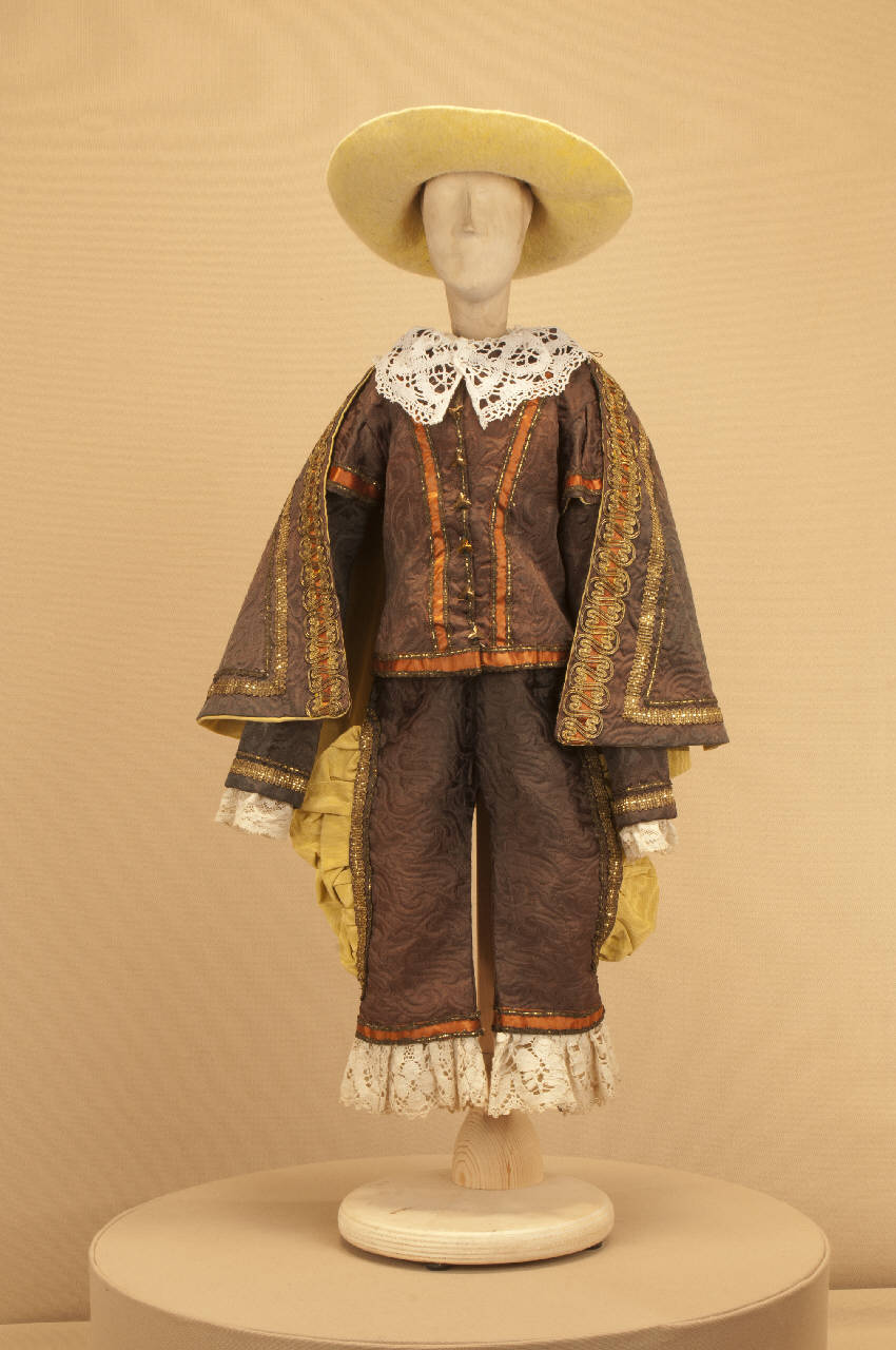 Costume da nobiluomo di foggia seicentesca composto da calzoni, giacca, collo e mantellina. Si completa con un cappello che ha il codice GOR 07280.