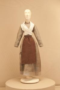 Costume da popolana di foggia seicentesca composto da veste, grembiule e fazzoletto da collo.