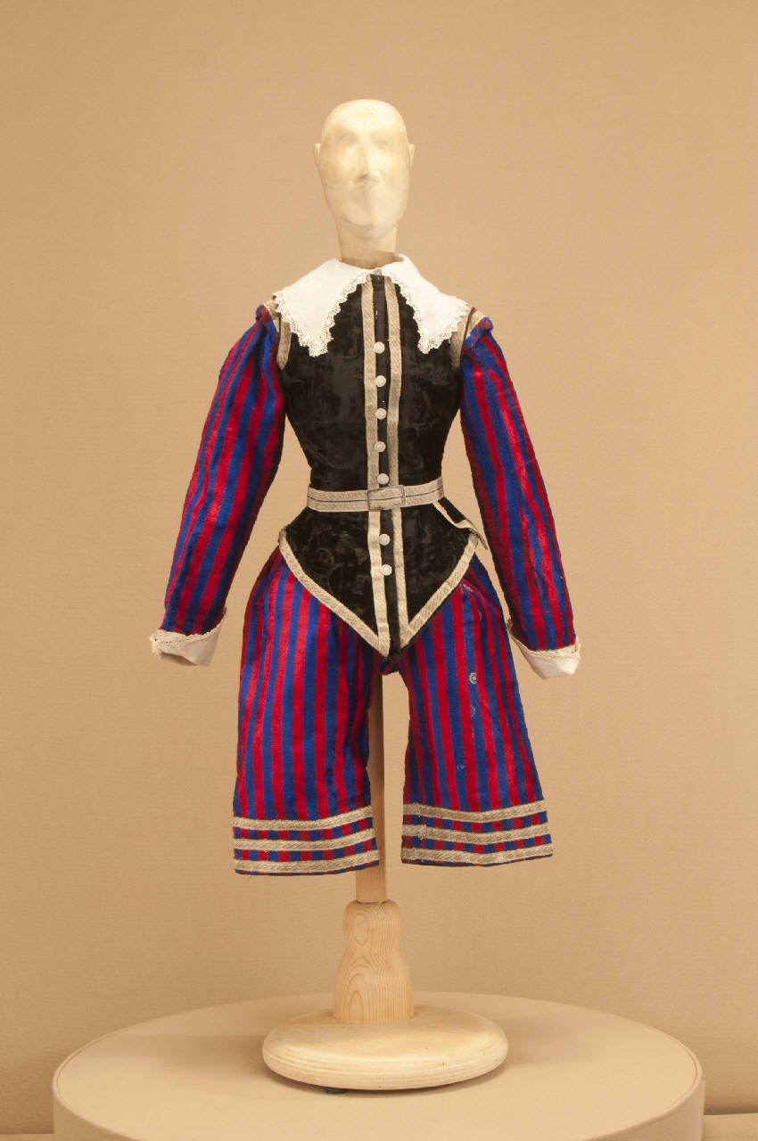 Costume da nobiluomo di foggia seicentesca composto da calzoni, corpino, giustacuore, cintura e collo.