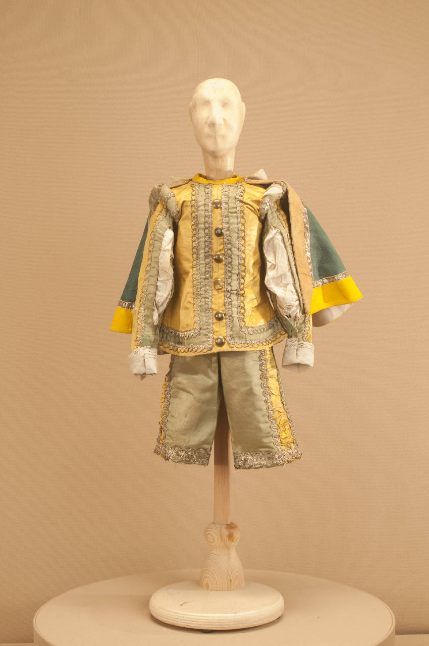 - NOTIZIE STORICO CRITICHE Dall'analisi stilistica del manufatto e per il fatto che deve essere indossato da una marionette di taglia piccola, si presume che il costume provenga dal materiale di Antonio Colla e che fosse usato per un personaggio della scena del "Palazzotto di Don Rodrigo". La mantellina è stata aggiunta in un secondo momento, presumibilmente nel 1927, quando il costume è stato attribuito ad un nobiluomo della processione. Il costume si completa con un collo. Lo spettacolo "I promessi sposi" entra nel repertorio della Compagnia Colla dopo il 1861, data in cui la Compagnia originaria si divide in tre ceppi. Alla formazione che porta il nome di Compagnia Carlo Colla & Figli viene assegnato, nella spartizione del materiale, il suddetto manoscritto. Ne ritroviamo la titolazione sul Libro Mastro soltanto il 19 Aprile del 1879, nella piazza di Sannazzaro.\nA ricordo di Carlo II Colla lo spettacolo seguiva una traccia piuttosto romanzata e poco fedele alla scritturazione manzoniana. Si chiudeva dopo la processione, poiché di tutto il capitolo che riguardava la peste, essendo questa malattia ancora diffusa tra le popolazioni, non si riteneva opportuno parlare. Nel 1927 Carlo II Colla curò un nuovo allestimento, andato in scena il 30 Aprile nella sala del Teatro Gerolamo, rifacendo molte scenografie e molti costumi, rinnovando ed allargando il vecchio materiale di sartoria. Rimasero così due scene del pittore Luigi Mens ("Interno casa di Lucia", "Palazzotto in Milano di Don Rodrigo"). Per le restanti ambientazioni Carlo II Colla si rivolse al pittore Achille Lualdi che operava già con la Compagnia dal 1911, con il quale si recò sui luoghi manzoniani perché i bozzetti delle scenografie rispettassero la geografia descritta dall¿autore. Nel 1996 Eugenio Monti Colla curò una nuova edizione dello spettacolo rifacendo alcuni costumi, aggiungendo alcuni episodi al testo e sostituendo la musica di Enrico Petrella con quella di Amilcare Ponchielli. Venne anche sostituito il personaggio maschera di Gerolamo, che impersonava Don Abbondio, con un carattere più consono a quello voluto dall¿attore. Nelle edizioni del 2004 e del 2014 è continuata l¿opera di rifacimento di alcuni costumi.