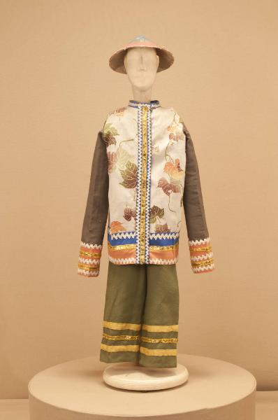 - NOTIZIE STORICO CRITICHE Il costume si completa con un paio di calzature in stile. Il cappello risale al 1849, data in cui andò in scena lo spettacolo con il nome "I riti chinesi"; nell'edizione del 1948 il costume è stato completamente rifatto. Lo spettacolo "Il drago verde" è una grandiosa azione coreografica in nove quadri messa in scena da Carlo Colla per la Compagnia Marionettistica Carlo Colla e Figli. La musica è stata composta dai maestri Strigazzi e Gualtieri e le ricchissime scene sono state dipinte da A. Lualdi e L. Mens.\nLo spettacolo, in repertorio fin dalla metà dell¿Ottocento col titolo "I riti chinesi" e indicato sui libri mastri come "Ballo I Chinesi" e sui tamburini del quotidiano "La Sera" come Drago Verde (dal 1913 al 1918), fu rielaborato per un nuovo allestimento solo nel 1948 dopo un lungo oblio e presentato nuovamente sulle scene del Teatro Gerolamo di Milano. Lo spettacolo è stato ripreso nel 1985 al Teatro dell'Arte e portato a Berlino per il Festival Horizonte.\nContrariamente a quanto il titolo farebbe pensare non si tratta di un tema fiabesco, ma di un ballo a sfondo storico sulla lotta per il potere delle dinastie imperiali. Il drago a cui si allude nel titolo è un idolo che protegge la dinastia regnante e aiuta a sconfiggere ogni tentativo di rivolta della deposta dinastia.