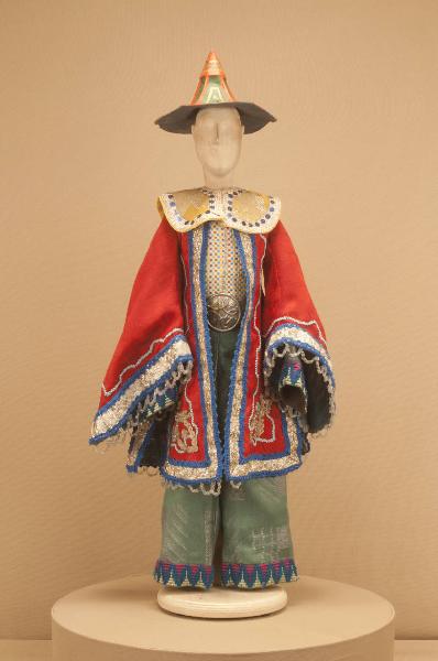 - NOTIZIE STORICO CRITICHE Il costume si completa con un paio di calzature in stile. La veste e il cappello risalgono al 1849, data in cui andò in scena lo spettacolo con il nome "I riti chinesi": nell'edizione del 1948 alcune parti del costume sono state rifatte. Lo spettacolo "Il drago verde"è una grandiosa azione coreografica in nove quadri messa in scena da Carlo Colla per la Compagnia Marionettistica Carlo Colla e Figli. La musica è stata composta dai maestri Strigazzi e Gualtieri e le ricchissime scene sono state dipinte da A. Lualdi e L. Mens.\nLo spettacolo, in repertorio fin dalla metà dell¿Ottocento col titolo "I riti chinesi" e indicato sui libri mastri come "Ballo I Chinesi" e sui tamburini del quotidiano "La Sera" come Drago Verde (dal 1913 al 1918), fu rielaborato per un nuovo allestimento solo nel 1948 dopo un lungo oblio e presentato nuovamente sulle scene del Teatro Gerolamo di Milano. Lo spettacolo è stato ripreso nel 1985 al Teatro dell'Arte e portato a Berlino per il Festival Horizonte.\nContrariamente a quanto il titolo farebbe pensare non si tratta di un tema fiabesco, ma di un ballo a sfondo storico sulla lotta per il potere delle dinastie imperiali. Il drago a cui si allude nel titolo è un idolo che protegge la dinastia regnante e aiuta a sconfiggere ogni tentativo di rivolta della deposta dinastia.