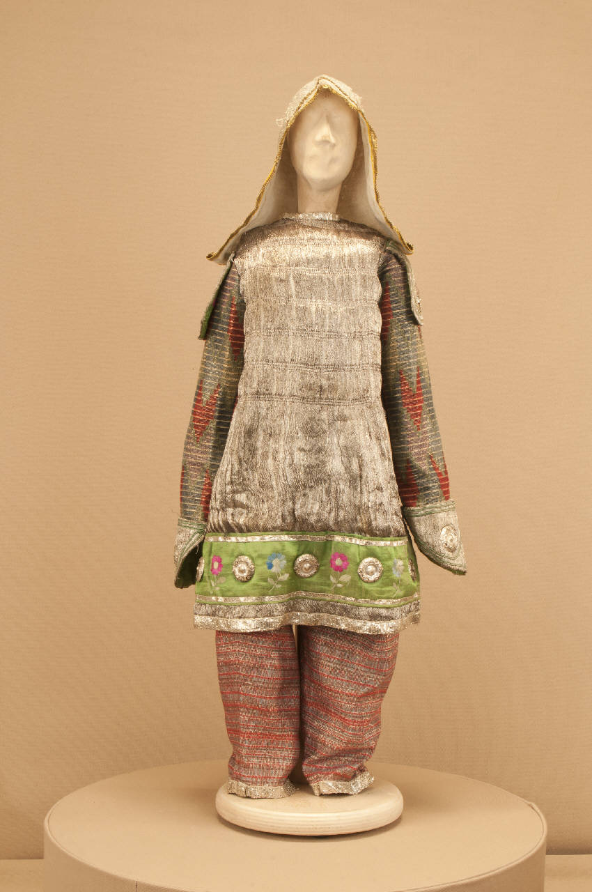 - NOTIZIE STORICO CRITICHE Il costume si completa con un paio di calzature in stile e con un elmo. Lo spettacolo "Il drago verde" è una grandiosa azione coreografica in nove quadri messa in scena da Carlo Colla per la Compagnia Marionettistica Carlo Colla e Figli. La musica è stata composta dai maestri Strigazzi e Gualtieri e le ricchissime scene sono state dipinte da A. Lualdi e L. Mens.\nLo spettacolo, in repertorio fin dalla metà dell¿Ottocento col titolo "I riti chinesi" e indicato sui libri mastri come "Ballo I Chinesi" e sui tamburini del quotidiano "La Sera" come Drago Verde (dal 1913 al 1918), fu rielaborato per un nuovo allestimento solo nel 1948 dopo un lungo oblio e presentato nuovamente sulle scene del Teatro Gerolamo di Milano. Lo spettacolo è stato ripreso nel 1985 al Teatro dell'Arte e portato a Berlino per il Festival Horizonte.\nContrariamente a quanto il titolo farebbe pensare non si tratta di un tema fiabesco, ma di un ballo a sfondo storico sulla lotta per il potere delle dinastie imperiali. Il drago a cui si allude nel titolo è un idolo che protegge la dinastia regnante e aiuta a sconfiggere ogni tentativo di rivolta della deposta dinastia.