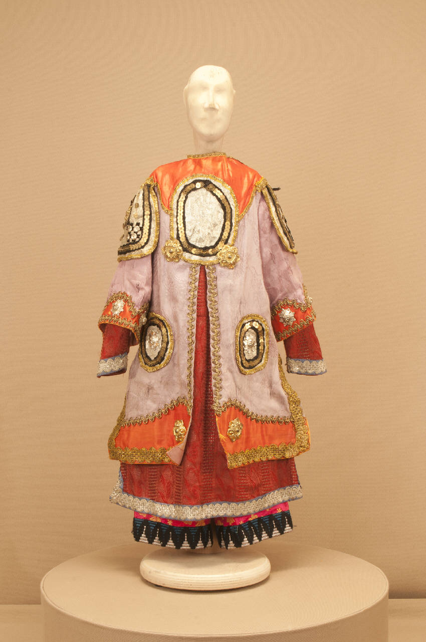 - NOTIZIE STORICO CRITICHE Il costume si completa con un paio di calzature in stile, con una cuffia militare e con un elmo. Lo spettacolo "Il drago verde" è una grandiosa azione coreografica in nove quadri messa in scena da Carlo Colla per la Compagnia Marionettistica Carlo Colla e Figli. La musica è stata composta dai maestri Strigazzi e Gualtieri e le ricchissime scene sono state dipinte da A. Lualdi e L. Mens.\nLo spettacolo, in repertorio fin dalla metà dell¿Ottocento col titolo " riti chinesi" e indicato sui libri mastri come "Ballo I Chinesi" e sui tamburini del quotidiano "La Sera" come Drago Verde (dal 1913 al 1918), fu rielaborato per un nuovo allestimento solo nel 1948 dopo un lungo oblio e presentato nuovamente sulle scene del Teatro Gerolamo di Milano. Lo spettacolo è stato ripreso nel 1985 al Teatro dell'Arte e portato a Berlino per il Festival Horizonte.\nContrariamente a quanto il titolo farebbe pensare non si tratta di un tema fiabesco, ma di un ballo a sfondo storico sulla lotta per il potere delle dinastie imperiali. Il drago a cui si allude nel titolo è un idolo che protegge la dinastia regnante e aiuta a sconfiggere ogni tentativo di rivolta della deposta dinastia.