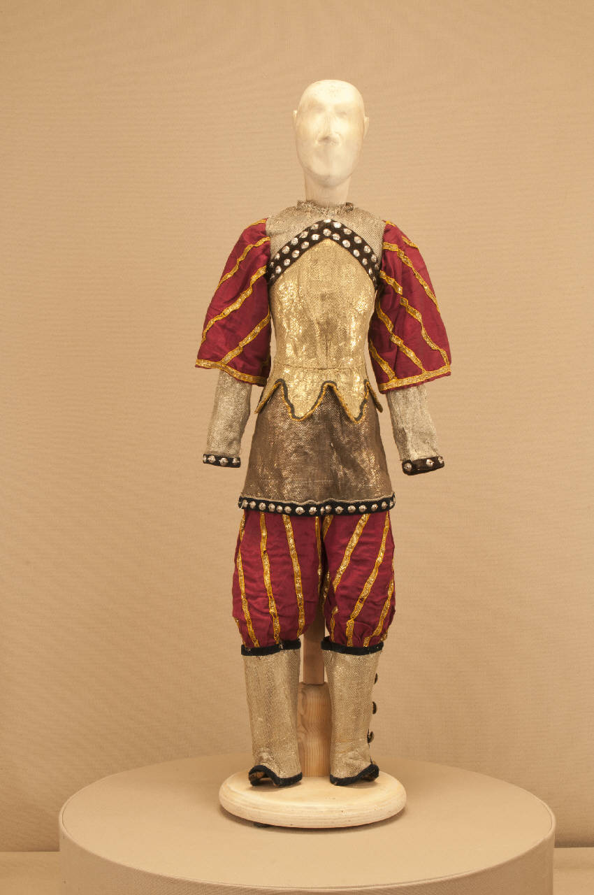 - NOTIZIE STORICO CRITICHE Il costume si completa con un paio di calzature in stile e con un elmo. La giacca e il cappello risalgono al 1849, data in cui andò in scena lo spettacolo con il nome "I riti chinesi"; i pantaloni al 1948. Lo spettacolo "Il drago verde" è una grandiosa azione coreografica in nove quadri messa in scena da Carlo Colla per la Compagnia Marionettistica Carlo Colla e Figli. La musica è stata composta dai maestri Strigazzi e Gualtieri e le ricchissime scene sono state dipinte da A. Lualdi e L. Mens.\nLo spettacolo, in repertorio fin dalla metà dell¿Ottocento col titolo "I riti chinesi" e indicato sui libri mastri come "Ballo I Chinesi" e sui tamburini del quotidiano "La Sera" come Drago Verde (dal 1913 al 1918), fu rielaborato per un nuovo allestimento solo nel 1948 dopo un lungo oblio e presentato nuovamente sulle scene del Teatro Gerolamo di Milano. Lo spettacolo è stato ripreso nel 1985 al Teatro dell'Arte e portato a Berlino per il Festival Horizonte.\nContrariamente a quanto il titolo farebbe pensare non si tratta di un tema fiabesco, ma di un ballo a sfondo storico sulla lotta per il potere delle dinastie imperiali. Il drago a cui si allude nel titolo è un idolo che protegge la dinastia regnante e aiuta a sconfiggere ogni tentativo di rivolta della deposta dinastia.