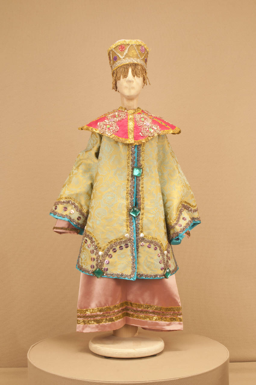 - NOTIZIE STORICO CRITICHE Il costume si completa con un paio di calzature in stile. Nel 2001 lil costume è stato rifatto completamente da Eugenio Monti Colla, riutilizzando gli elementi decorativi antichi. Lo spettacolo "Il drago verde" è una grandiosa azione coreografica in nove quadri messa in scena da Carlo Colla per la Compagnia Marionettistica Carlo Colla e Figli. La musica è stata composta dai maestri Strigazzi e Gualtieri e le ricchissime scene sono state dipinte da A. Lualdi e L. Mens.\nLo spettacolo, in repertorio fin dalla metà dell¿Ottocento col titolo "I riti chinesi"e indicato sui libri mastri come "Ballo I Chinesi" e sui tamburini del quotidiano "La Sera" come Drago Verde (dal 1913 al 1918), fu rielaborato per un nuovo allestimento solo nel 1948 dopo un lungo oblio e presentato nuovamente sulle scene del Teatro Gerolamo di Milano. Lo spettacolo è stato ripreso nel 1985 al Teatro dell'Arte e portato a Berlino per il Festival Horizonte.\nContrariamente a quanto il titolo farebbe pensare non si tratta di un tema fiabesco, ma di un ballo a sfondo storico sulla lotta per il potere delle dinastie imperiali. Il drago a cui si allude nel titolo è un idolo che protegge la dinastia regnante e aiuta a sconfiggere ogni tentativo di rivolta della deposta dinastia.