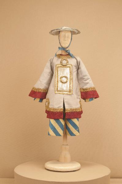 - NOTIZIE STORICO CRITICHE Il costume si completa con un paio di calzature in stile. Lo spettacolo "Il drago verde" è una grandiosa azione coreografica in nove quadri messa in scena da Carlo Colla per la Compagnia Marionettistica Carlo Colla e Figli. La musica è stata composta dai maestri Strigazzi e Gualtieri e le ricchissime scene sono state dipinte da A. Lualdi e L. Mens.\nLo spettacolo, in repertorio fin dalla metà dell¿Ottocento col titolo "I riti chinesi" e indicato sui libri mastri come "Ballo I Chinesi" e sui tamburini del quotidiano "La Sera" come Drago Verde (dal 1913 al 1918), fu rielaborato per un nuovo allestimento solo nel 1948 dopo un lungo oblio e presentato nuovamente sulle scene del Teatro Gerolamo di Milano. Lo spettacolo è stato ripreso nel 1985 al Teatro dell'Arte e portato a Berlino per il Festival Horizonte.\nContrariamente a quanto il titolo farebbe pensare non si tratta di un tema fiabesco, ma di un ballo a sfondo storico sulla lotta per il potere delle dinastie imperiali. Il drago a cui si allude nel titolo è un idolo che protegge la dinastia regnante e aiuta a sconfiggere ogni tentativo di rivolta della deposta dinastia.