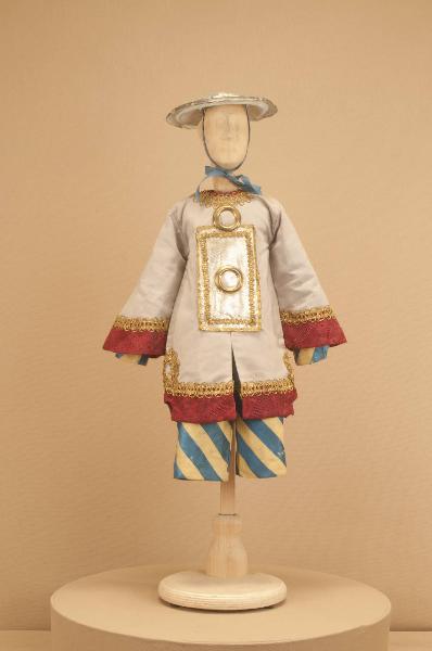 - NOTIZIE STORICO CRITICHE Il costume si completa con un paio di calzature in stile. Lo spettacolo "Il drago verde" è una grandiosa azione coreografica in nove quadri messa in scena da Carlo Colla per la Compagnia Marionettistica Carlo Colla e Figli. La musica è stata composta dai maestri Strigazzi e Gualtieri e le ricchissime scene sono state dipinte da A. Lualdi e L. Mens.\nLo spettacolo, in repertorio fin dalla metà dell¿Ottocento col titolo "I riti chinesi" e indicato sui libri mastri come "Ballo I Chinesi" e sui tamburini del quotidiano "La Sera" come Drago Verde (dal 1913 al 1918), fu rielaborato per un nuovo allestimento solo nel 1948 dopo un lungo oblio e presentato nuovamente sulle scene del Teatro Gerolamo di Milano. Lo spettacolo è stato ripreso nel 1985 al Teatro dell'Arte e portato a Berlino per il Festival Horizonte.\nContrariamente a quanto il titolo farebbe pensare non si tratta di un tema fiabesco, ma di un ballo a sfondo storico sulla lotta per il potere delle dinastie imperiali. Il drago a cui si allude nel titolo è un idolo che protegge la dinastia regnante e aiuta a sconfiggere ogni tentativo di rivolta della deposta dinastia.