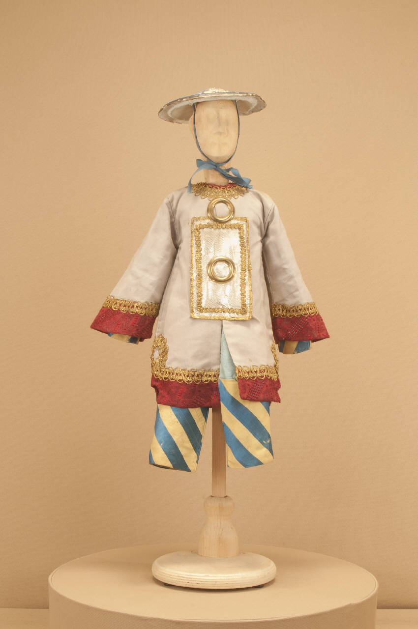 - NOTIZIE STORICO CRITICHE Il costume si completa con un paio di calzature in stile. Lo spettacolo "Il drago verde"è una grandiosa azione coreografica in nove quadri messa in scena da Carlo Colla per la Compagnia Marionettistica Carlo Colla e Figli. La musica è stata composta dai maestri Strigazzi e Gualtieri e le ricchissime scene sono state dipinte da A. Lualdi e L. Mens.\nLo spettacolo, in repertorio fin dalla metà dell¿Ottocento col titolo "I riti chinesi" e indicato sui libri mastri come "Ballo I Chinesi" e sui tamburini del quotidiano "La Sera" come Drago Verde (dal 1913 al 1918), fu rielaborato per un nuovo allestimento solo nel 1948 dopo un lungo oblio e presentato nuovamente sulle scene del Teatro Gerolamo di Milano. Lo spettacolo è stato ripreso nel 1985 al Teatro dell'Arte e portato a Berlino per il Festival Horizonte.\nContrariamente a quanto il titolo farebbe pensare non si tratta di un tema fiabesco, ma di un ballo a sfondo storico sulla lotta per il potere delle dinastie imperiali. Il drago a cui si allude nel titolo è un idolo che protegge la dinastia regnante e aiuta a sconfiggere ogni tentativo di rivolta della deposta dinastia.