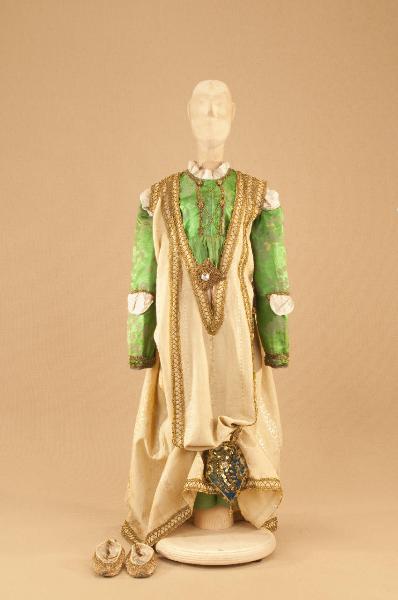 Costume da nobildonna di foggia quattrocentesca composto da veste, sopravveste, cintura (con borsetta) e scarpe.
