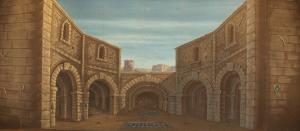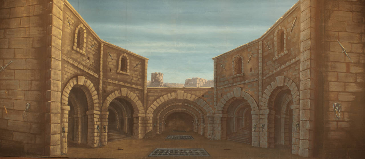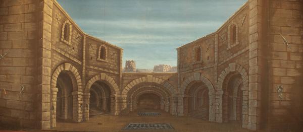 Scenografia composta da un fondale. Supporto in carta siling avana extra da 80 g. al mq. dipinto con colori a terra uniti con leganti vinilici e fortezzato con strisce in tela di cotone di diverse grammature lungo i bordi perimetrali e lungo le linee di piegatura.