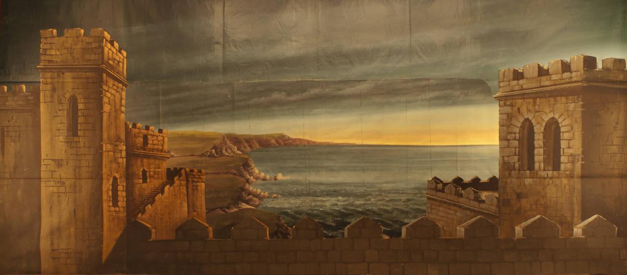 Scenografia composta da un fondale e un principale. Supporto in carta siling avana extra da 80 g. al mq. dipinto con colori a terra uniti con leganti vinilici e fortezzato con strisce in tela di cotone di diverse grammature lungo i bordi perimetrali e lungo le linee di piegatura.