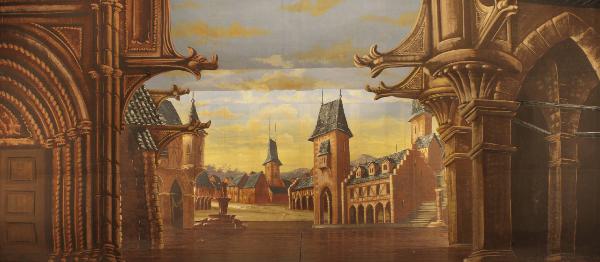 Scenografia composta da un fondale e tre principali. Supporto in carta siling avana extra da 80 g. al mq. dipinto con colori a terra uniti con leganti vinilici e fortezzato con strisce in tela di cotone di diverse grammature lungo i bordi perimetrali e lungo le linee di piegatura.