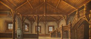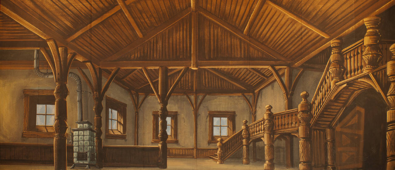 Scenografia composta da un fondale. Supporto in carta siling avana extra da 80 g. al mq. dipinto con colori a terra uniti con leganti vinilici e fortezzato con strisce in tela di cotone di diverse grammature lungo i bordi perimetrali e lungo le linee di piegatura.