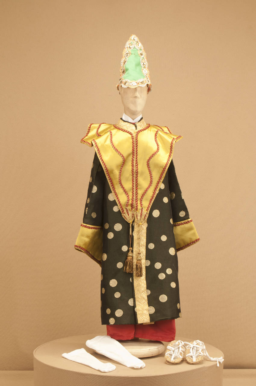 Costume fantastico composto da pantaloni, corpino, veste, collo, collare, calze, cappello e sandali.