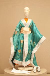 Costume da geisha composto da kimono, veste, obi, calze e sandali.