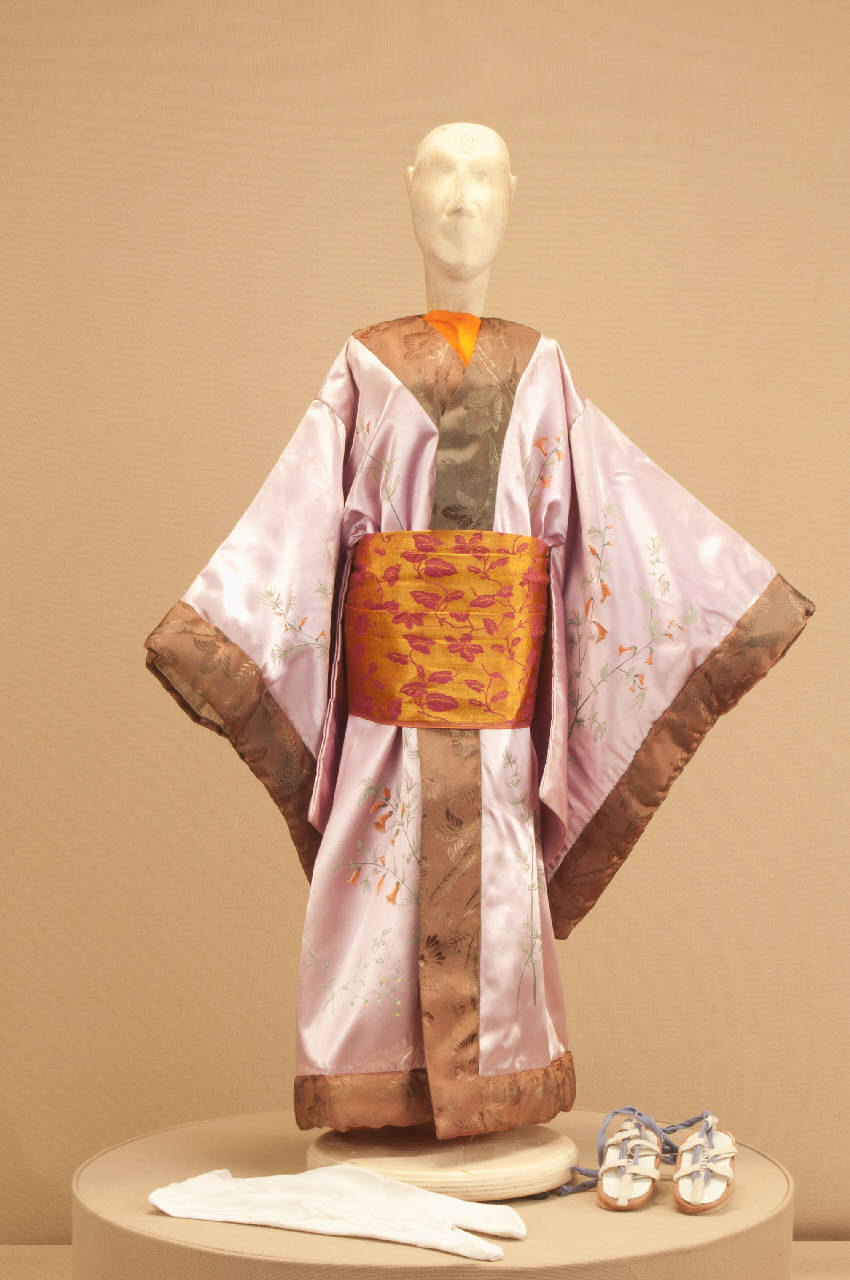Costume da geisha composto da kimono, veste, obi, calze e sandali.