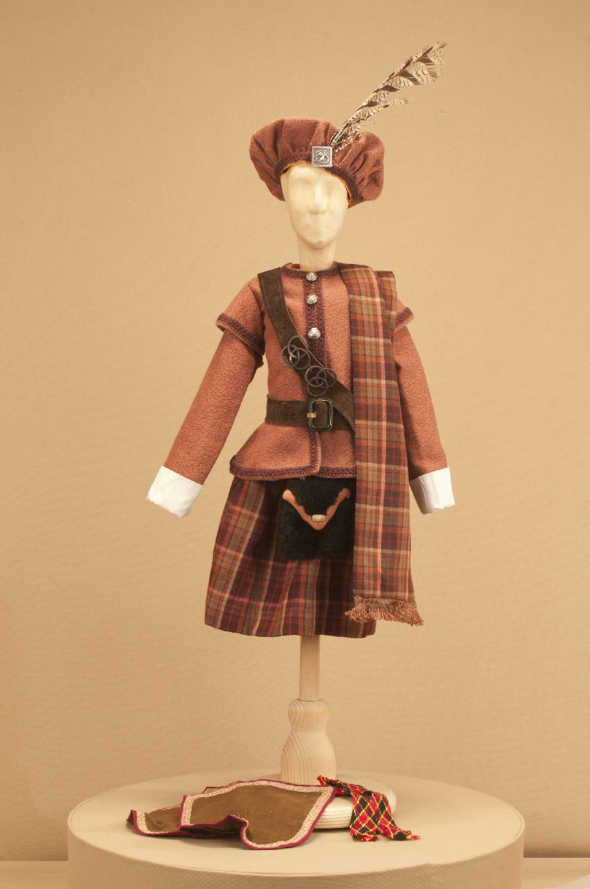 Costume scozzese per militare di foggia seicentesca composto da kilt, giacca, sciarpa, cintura, bandoliera, cappello, uose, finte calze.