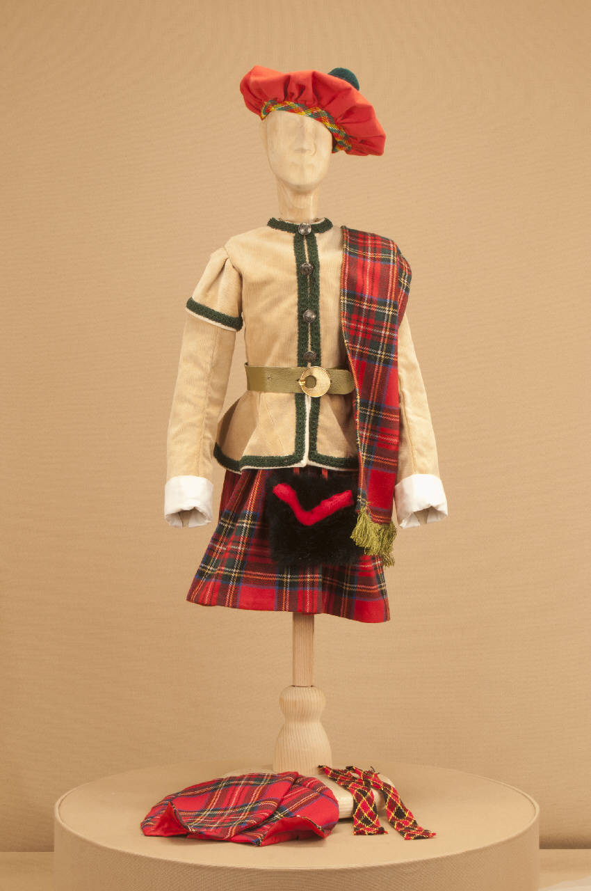 Costume scozzese di foggia seicentesca composto da kilt, giacca, sciarpa, cintura, cappello, uose, finte calze.