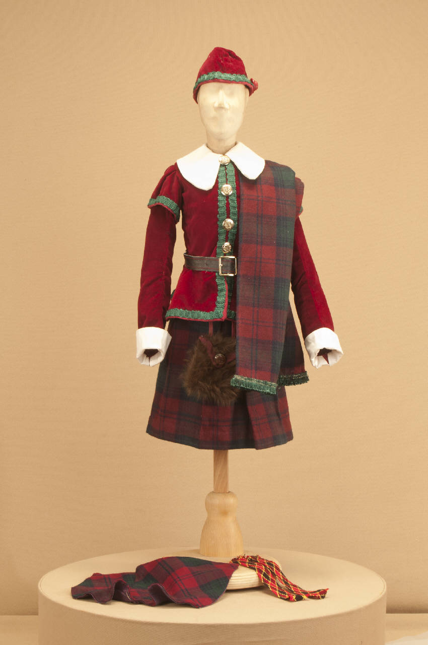 Costume scozzese di foggia seicentesca composto da kilt, giacca, sciarpa, cintura, cappello, collo, uose, finte calze.