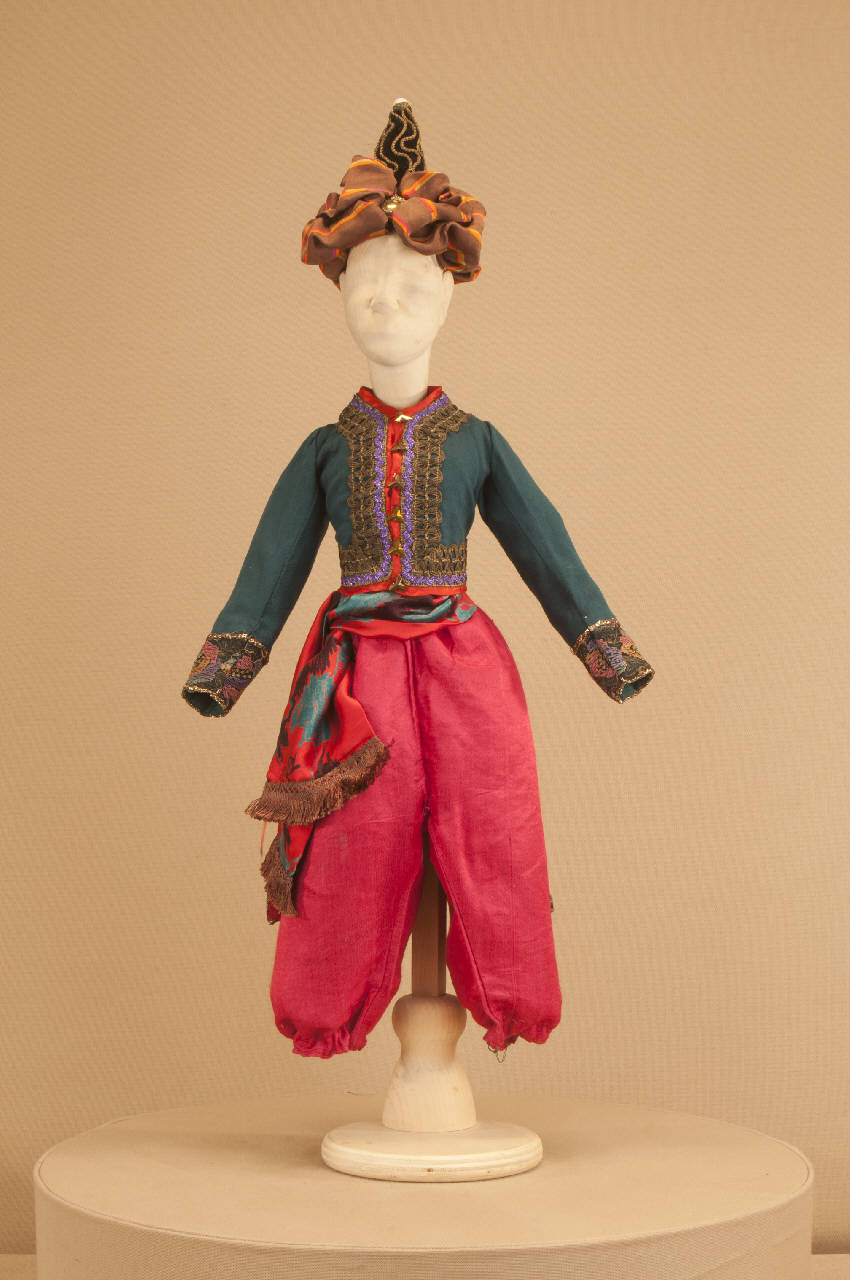 Livrea di foggia orientale per bambino composto da pantaloni, giacca e fusciacca. SI completa con un copricapo che ha il codice C 07812.