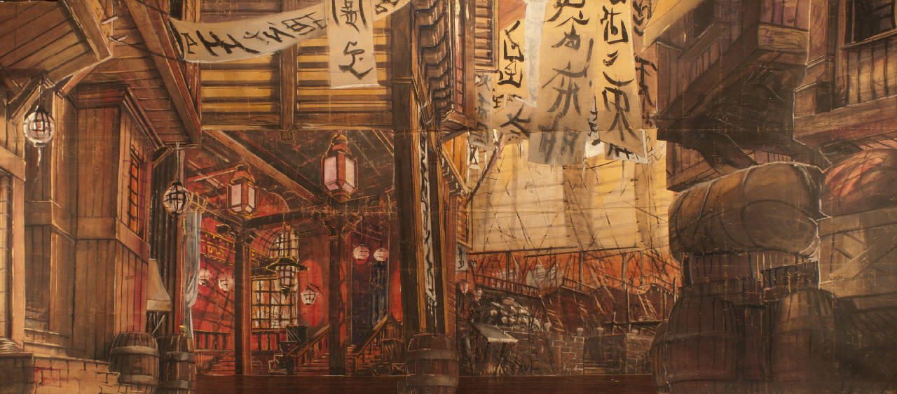 Scenografia composta da un fondale e un principale. Supporto in carta siling avana extra da 80 g. al mq. dipinto con colori a terra uniti con leganti vinilici e fortezzato con strisce in tela di cotone di diverse grammature lungo i bordi perimetrali e lungo le linee di piegatura. Applicazione di tela leggera per la trasparenza delle lanterne.