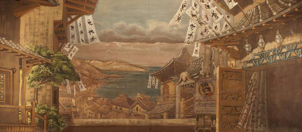 Scenografia composta da un fondale e un principale. Supporto in carta siling avana extra da 80 g. al mq. dipinto con colori a terra uniti con leganti vinilici e fortezzato con strisce in tela di cotone di diverse grammature lungo i bordi perimetrali e lungo le linee di piegatura.