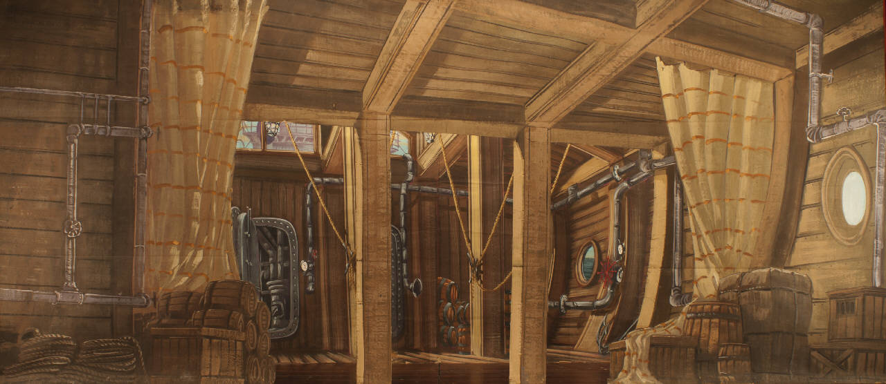 - NOTIZIE STORICO CRITICHE La scenografia è stata realizzata in occasione dell'allestimento dello spettacolo nel 1992.Al Teatro Gerolamo di Milano, sede stabile della Compagnia Carlo Colla e Figli dal 1906 al 1957, "Il giro del mondo in 80 giorni" è sempre stato uno dei titoli più rappresentati sino al 1938, anno in cui, a causa delle leggi razziali, il regime ne proibì la rappresentazione poiché il romanzo termina con il matrimonio tra il protagonista, l'europeo Phileas Fogg, e l'indiana Auda. Insieme al "Ballo Excelsior" e al "Cristoforo Colombo", l'adattamento dello scritto di Jules Verne costituisce, nel repertorio della compagnia, la triade inneggiante alla vittoria del progresso e del tecnicismo. La vecchia edizione di Carlo II Colla era stata concepita nel 1897 con criterio estremamente realistico, tant'è che il personaggio di Passepartout era stato sostituito dall'autore con quello della maschera di Gerolamo seguendo una concezione popolare. La nuova edizione, presentata in prima assoluta al 35° Festival dei Due Mondi di Spoleto nel 1992, con musiche originali di repertorio adattate dal maestro Danilo Lorenzini, tende a risolvere in chiave più ironica l'incredibile viaggio e ripristina l¿originale personaggio di Passepartout. Nel 1998 il materiale antico è stato completamente sostituito con nuovi costumi, nuove marionette e nuovi materiali di attrezzeria e scenografia. Lo spettacolo è stato portato in tournè in tutta Europa, in America (Festival di Charleston, 2000) e in Australia (2001).
