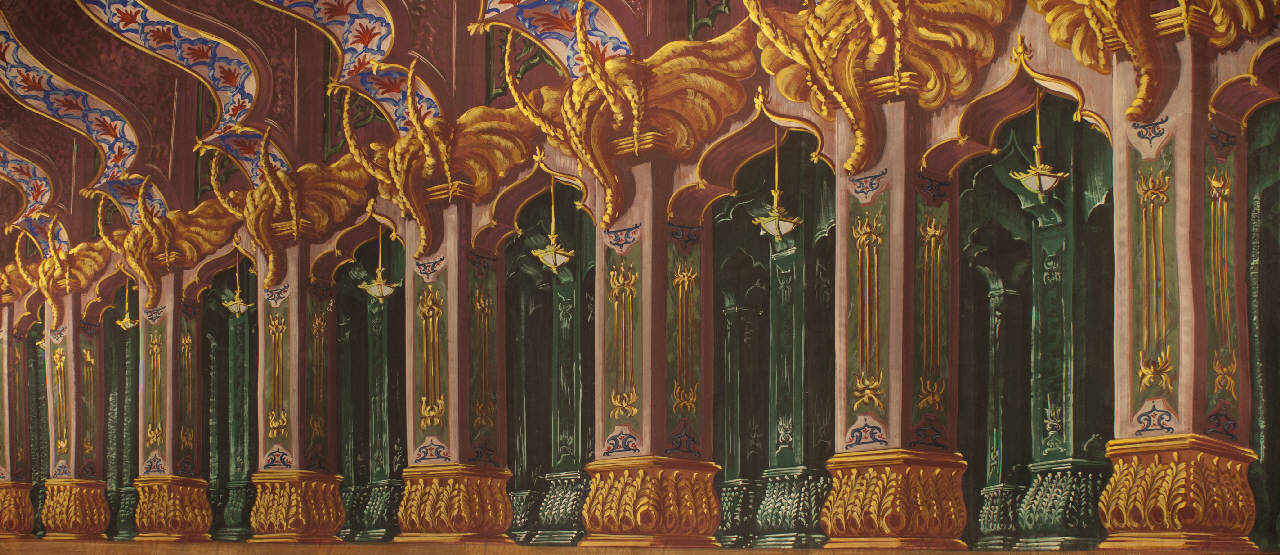 Scenografia composta da un fondale. Supporto in carta siling avana extra da 80 g. al mq. dipinto con colori a terra uniti con leganti vinilici e fortezzato con strisce in tela di cotone di diverse grammature lungo i bordi perimetrali e lungo le linee di piegatura. Il fondale presenta 7 inserti in tela leggera per le trasparenze delle lanterne.