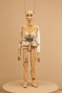 Testa in legno di tiglio fissata al corpo tramite ferro, occhi di vetro. Corpo normale in abete tagliato in vita e raccordato con viti ad anello e tela. Gambe unite al bacino tramite bordione in ferro, ginocchia ad incastro mobile. Mani in tiglio con dita scolpite e separate. Bilancino a croce metodo Holden.