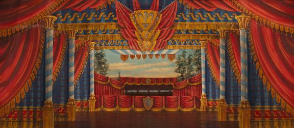 Scenografia composta da un fondale, tre principali e sette rompimenti. Supporto in tela di cotone da 20o g. al mq. e carta siling avana extra da 80 g. al mq. dipinto con colori a terra uniti con leganti vinilici. Fortezzature ribattute con strisce in tela di cotone di diverse grammature lungo i bordi perimetrali e lungo le linee di piegatura.