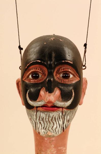 Testa in legno di tiglio con anello in ferro per bloccaggio al corpo. Occhi di vetro mobili. Bocca mobile. Tassello posteriore per intervenire sui meccanismi interni.