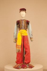 Costume per nobile di foggia orientale composto da pantaloni, corpino, bolero, fusciacca, uose e cappello.