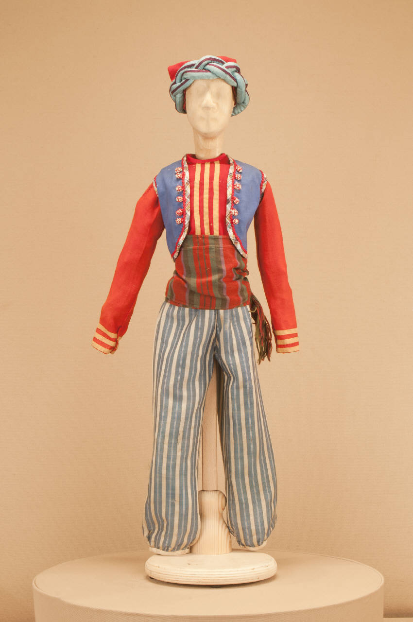 Costume folcloristico di foggia orientale composto da pantaloni, corpino, bolero, fascia, berretto e turbante.